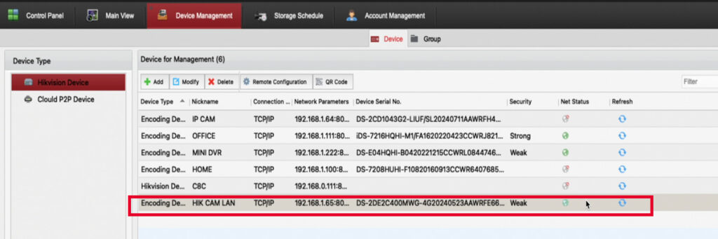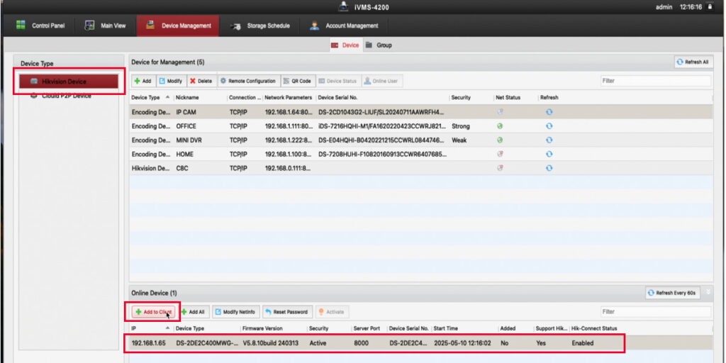 - Go to Device Management: Locate the Hikvision Device Type section and click on Online Device. This will display a list of all Hikvision devices connected to your local network.