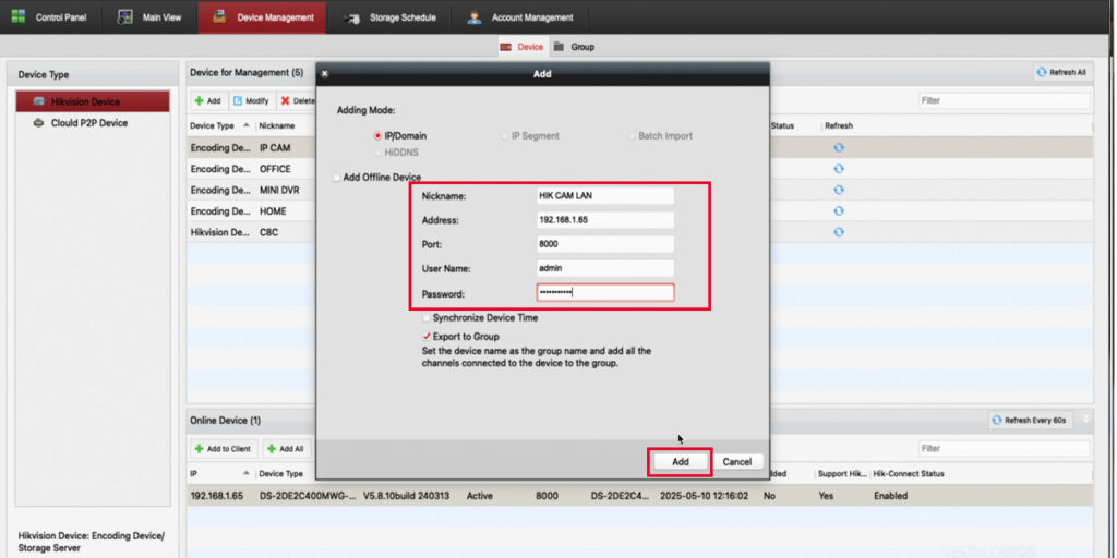 - Complete the Process: Click Add to finalize. Your camera will now appear in the Device Management table, showing its IP address, network status, and other details. A green icon or “Online” status confirms a successful connection.