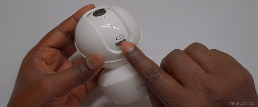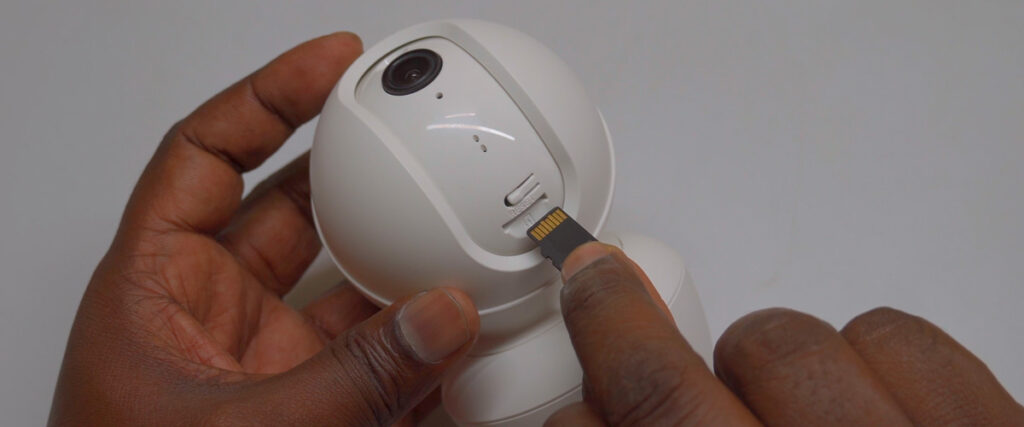 Power OFF camera completely (unplug adapter) before installing to avoid damage. Locate the microSD slot on the bottom or side near base (gently tilt camera 45° to see small rectangular opening).