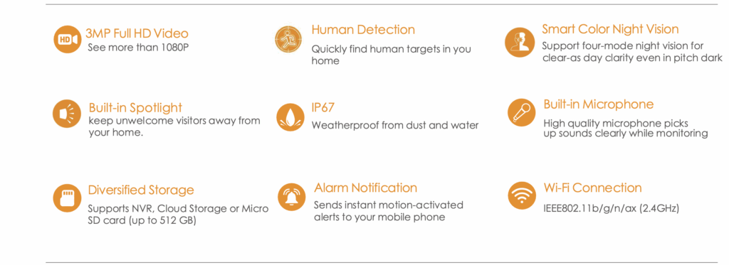 - Intelligent Active Alarms: Advanced image processing detects human movement quickly, sending instant alerts with live video feeds. A built-in spotlight activates to deter intruders, boosting your security.