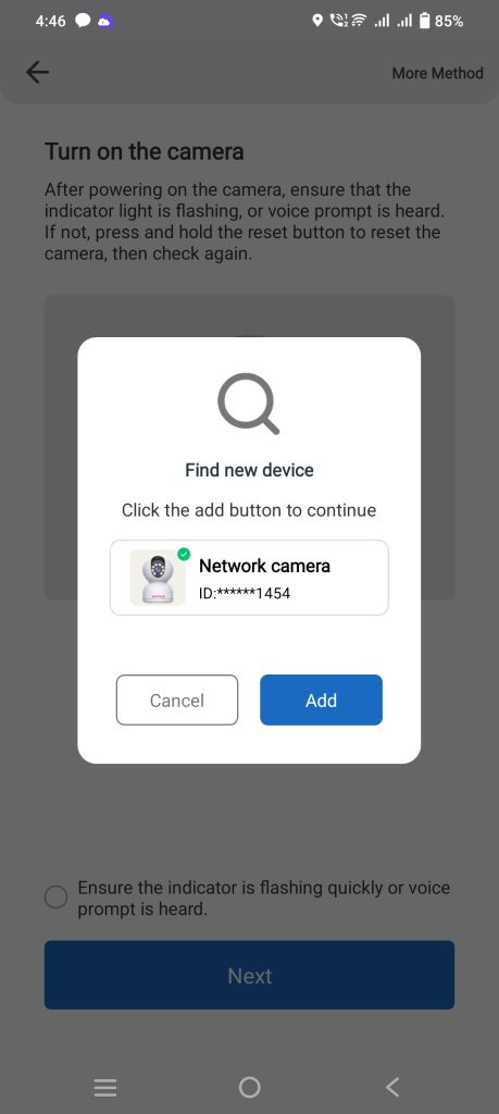 The camera will take a moment to boot up. after 1-2mins the camera will prompt the message ‘waiting for network connection’ indicating that it’s ready to be configured with the mobile app. If the voice prompt does not hear, you may reset the camera using the reset button.