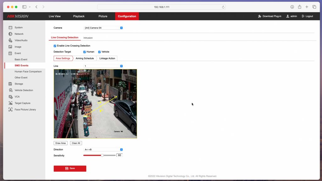 - Click ‘Draw Area’ to draw the detection line on the camera feed.