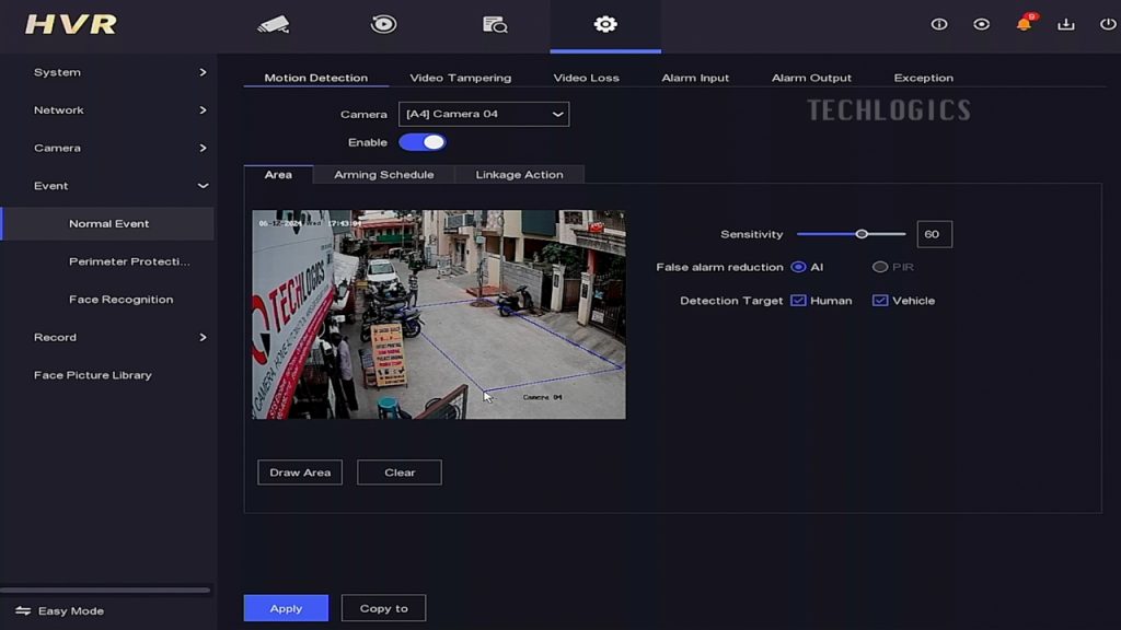 - Use the ‘Draw Area’ feature to specify regions within the camera’s view where motion detection should be active. Simply click and drag to outline the desired area.