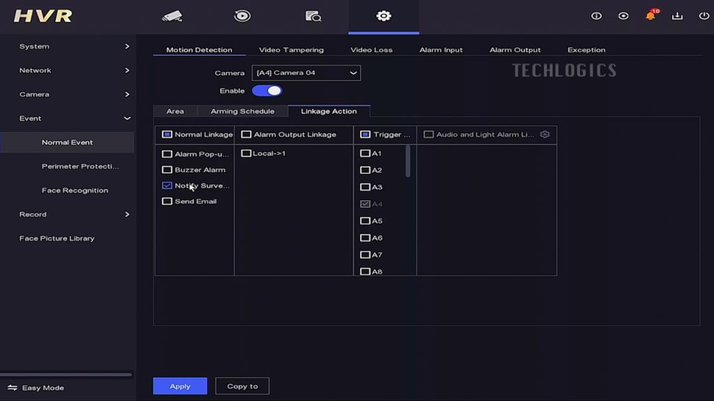 - Navigate to the system configuration on your DVR and select ‘Normal Event’, then ‘Motion Detection’.