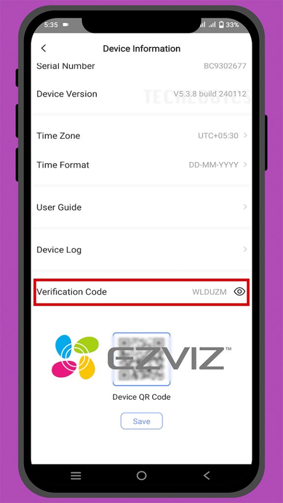 • Step 6: Here, you’ll find various details about your camera, including the “Verification Code.” Click the ‘Eye’ icon to unhide and view the code.