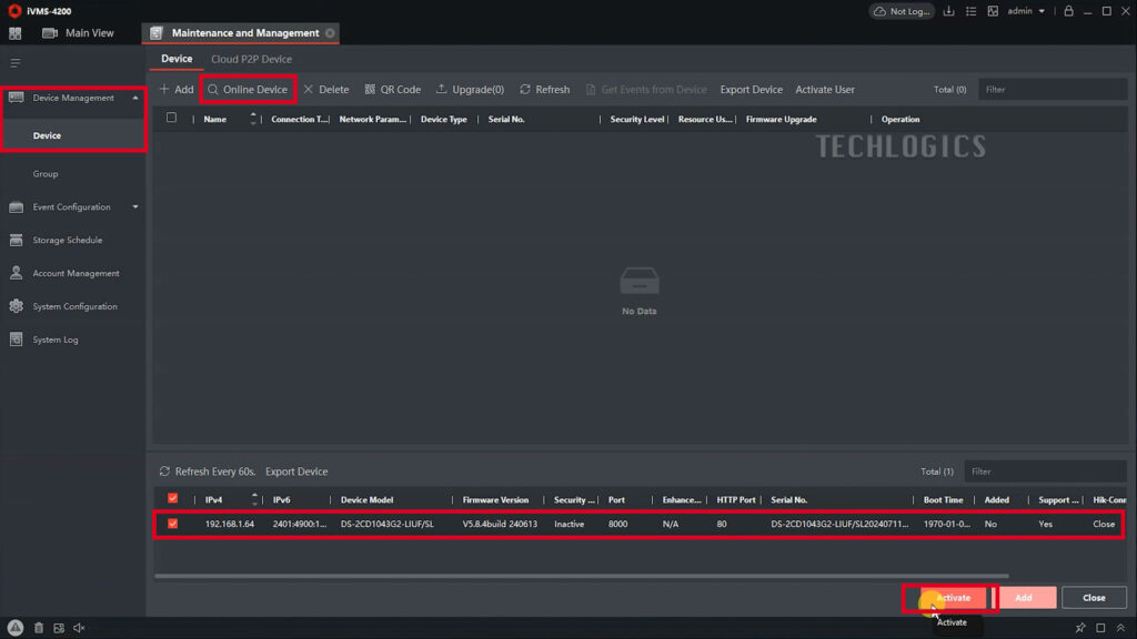 In the iVMS-4200 software, go to the ‘Device Management’ section. Click on the ‘Device’ tab to proceed. From here, click on ‘Online Device’ to display a list of all Hikvision devices that are currently connected to your LAN network.
