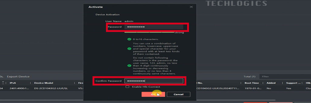 After entering the password, a green checkmark will appear next to the password fields, indicating that the password meets the required security criteria. Click ‘OK’ to complete the activation.