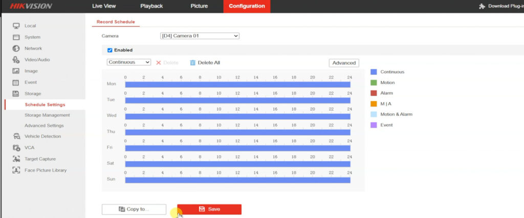 To customize how the camera records, go to Configuration > Storage > Schedule Settings: