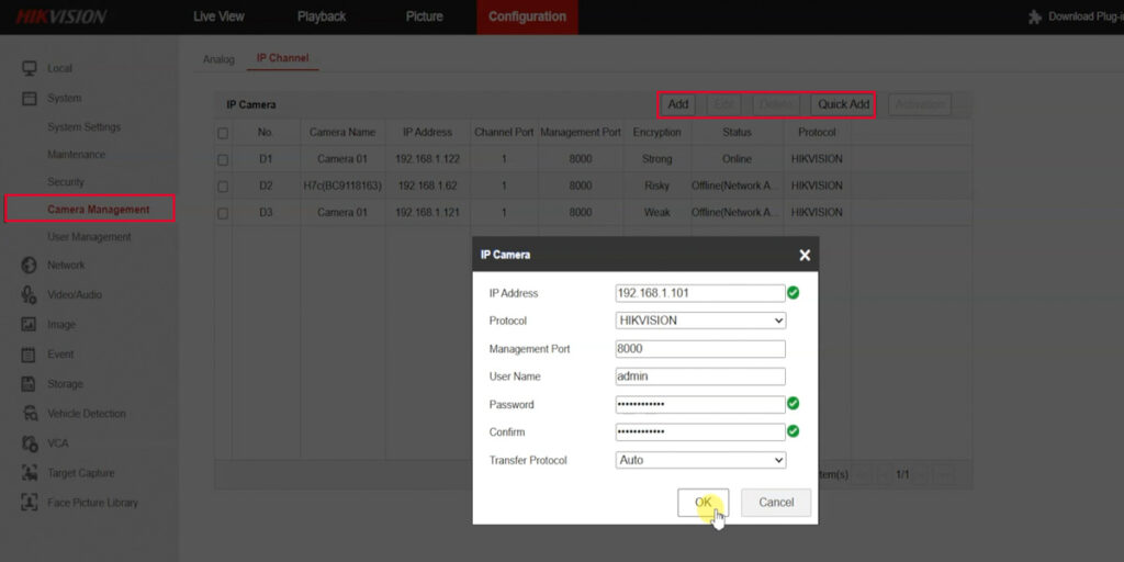 - Quick Add Option: Select “Quick Add” to allow the DVR to scan the LAN network and list detected cameras.