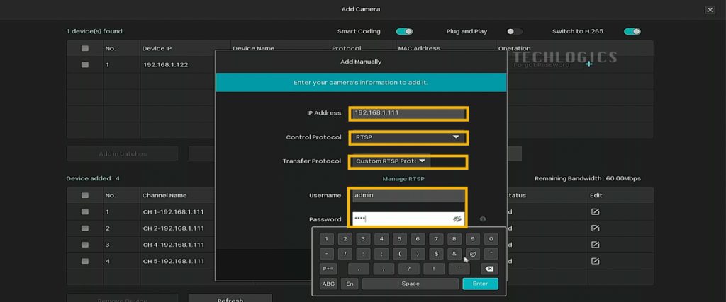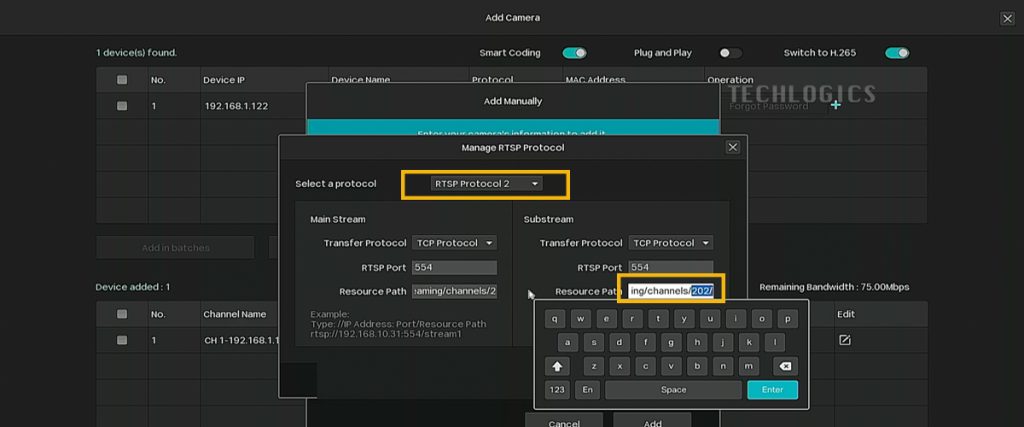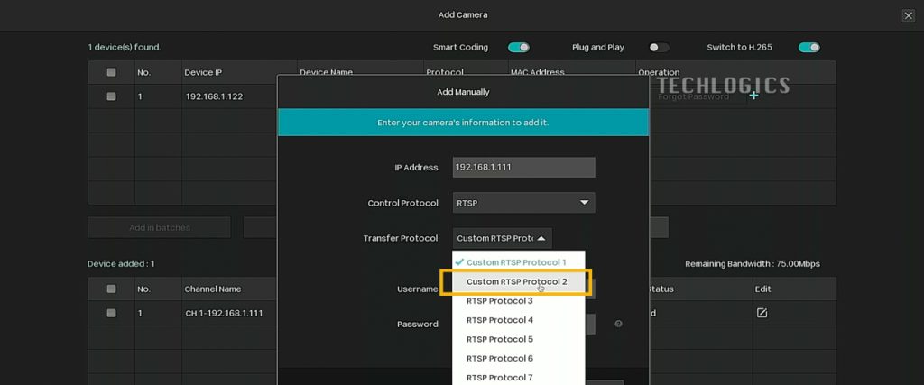 Now, select the configured protocol, which is “RTSP Protocol 1,” for the first camera. Enter the username and password for the Hikvision DVR to authenticate the connection. Use “admin” as the username and the DVR’s password for this step. Finally, click the “Add” button to add the first channel stream of the Hikvision camera.