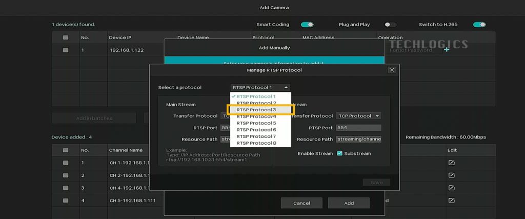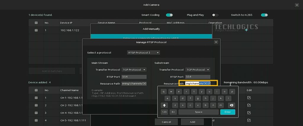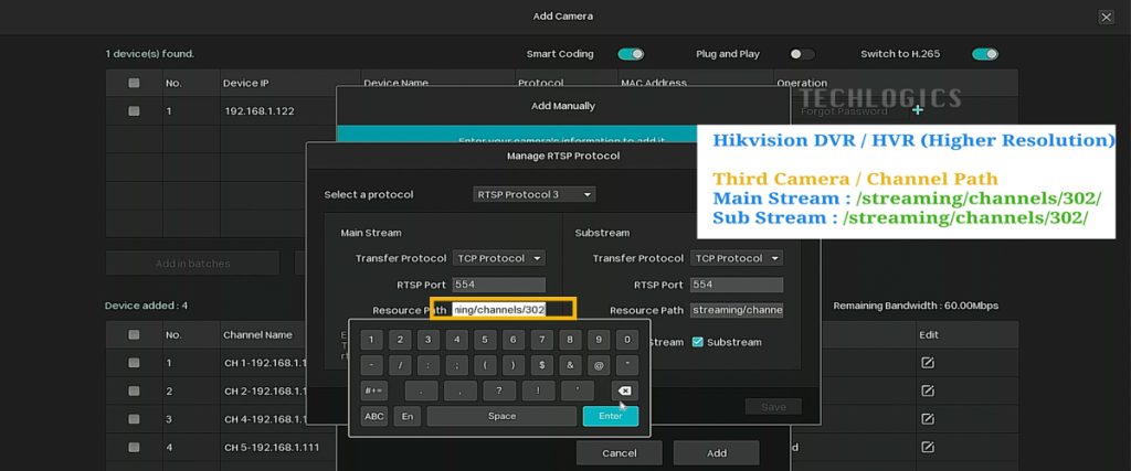 Input the Hikvision DVR’s IP address in the ‘IP Address’ field. After that, click on the “Manage RTSP” option to enter the Hikvision RTSP streaming path. The resource path is generally consistent across all channels, with only the camera channel number differing.