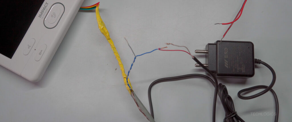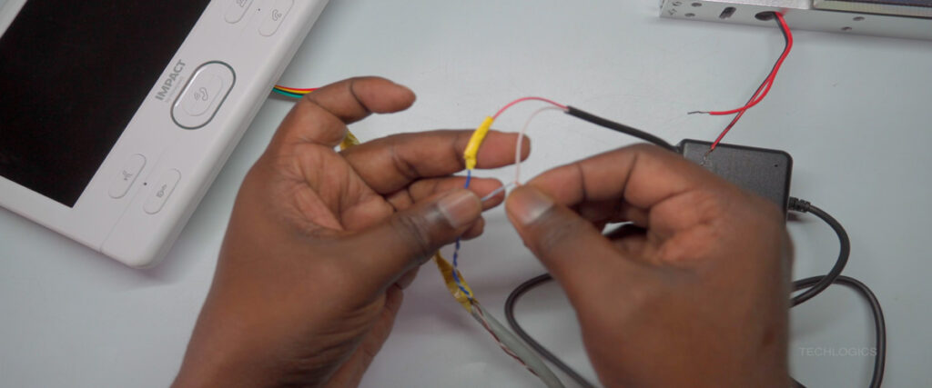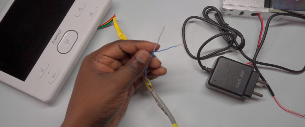 We’ll utilize the reserved CAT6 cable running from the indoor screen to the door station. This cable contains multiple wire pairs, but we’ll focus on the blue pair to carry power to the Electromagnetic Lock. The brown pair and other wires will remain unused, reserved for future expansions or additional connections. Using the existing CAT6 cable keeps the setup tidy and minimizes extra wiring.