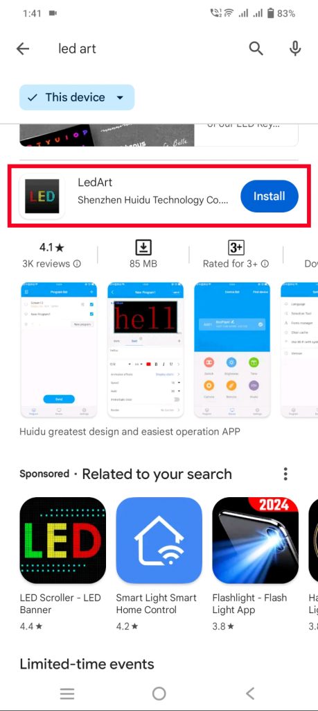 - Download and install “LED art” from the Play Store. This app allows configuration of panel settings (resolution, brightness), creation of dynamic content (text, images, animations, clocks), and remote control functionality.