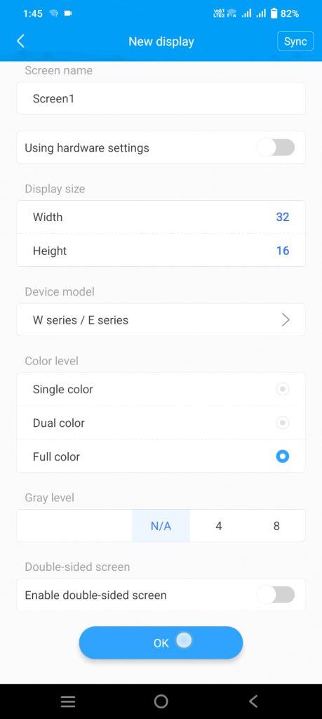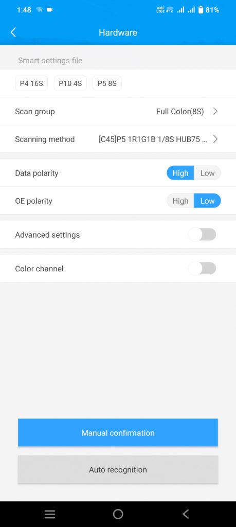 - In the LED art app’s ‘Hardware’ settings, authenticate with password ‘888’ and select the P10 display model (‘8S Full Color’) under ‘Scan Group’ based on your panel series (e.g., 8S RGB).