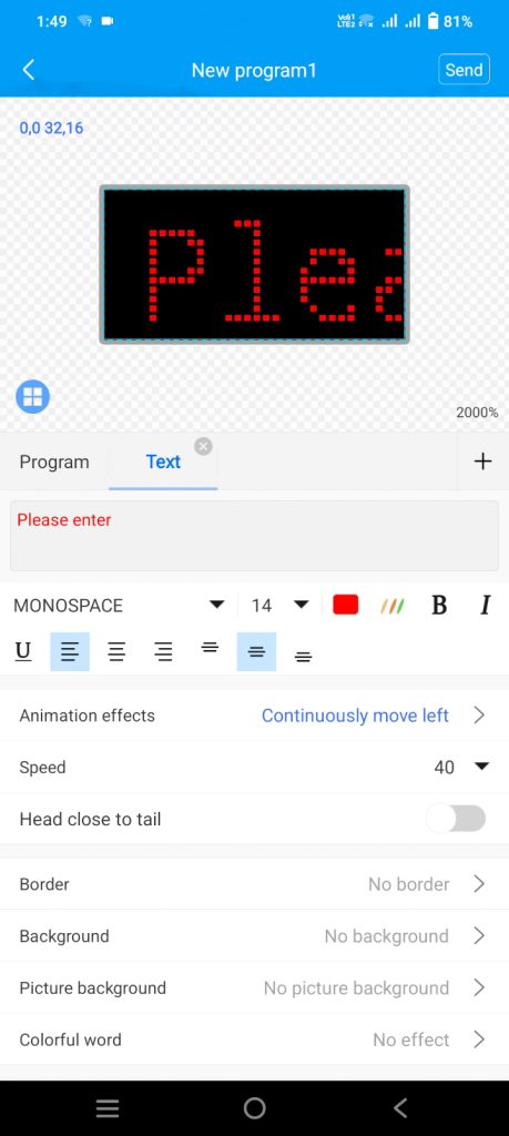 - Set font size to 14, choose ‘continuously move left’ animation effect, and adjust speed (30-40) for desired animation on the LED display. Transmit this program to the controller.