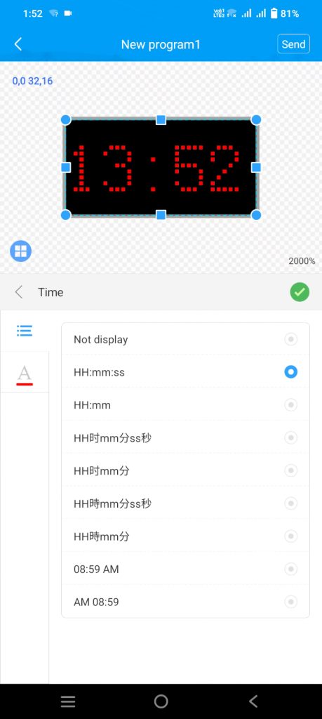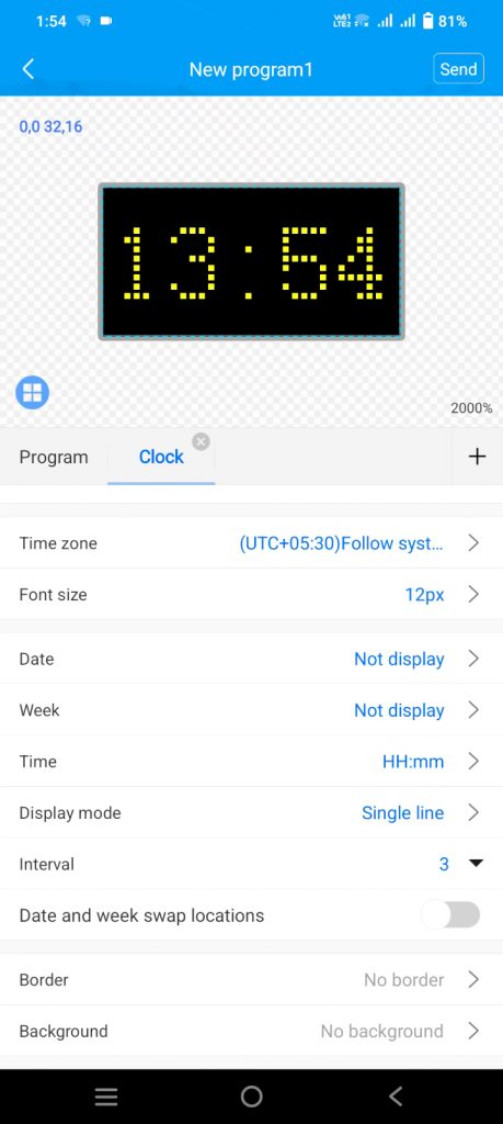 - Choose either 24-hour or 12-hour format for the clock ‘time,’ hide date and week display, and set font size (12-14). Customize clock time color to your preference and send the program to the controller.