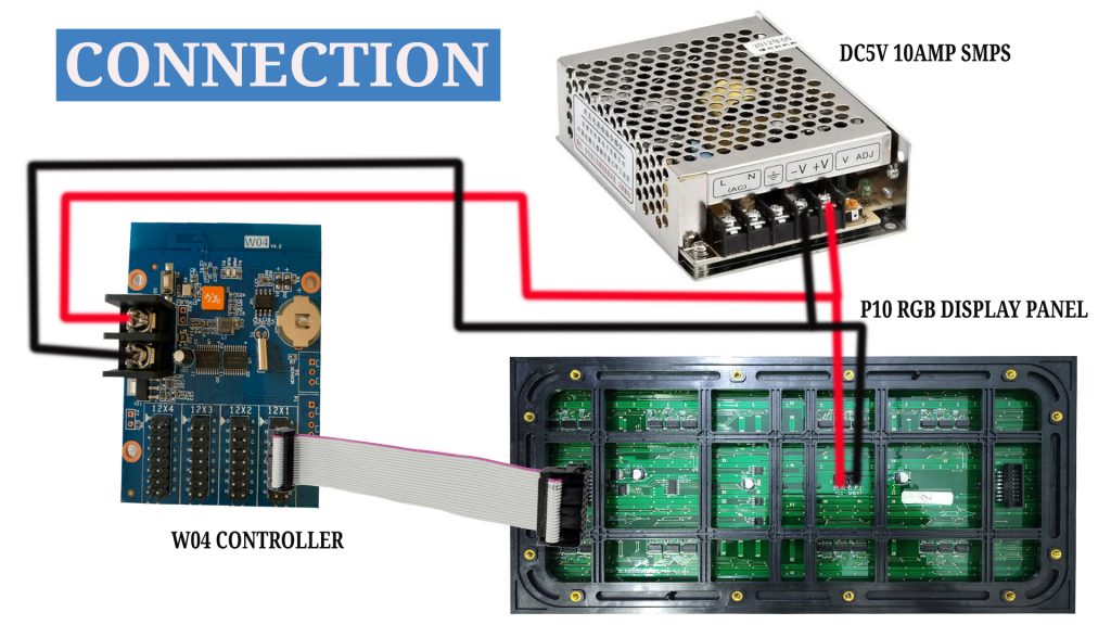 Initial Setup: Begin by connecting the power cable from the SMPS to the controller, ensuring correct polarity with positive and negative connections. For a single P10 panel, use a DC5V 10AMP SMPS; for multiple panels, adjust amperage accordingly.