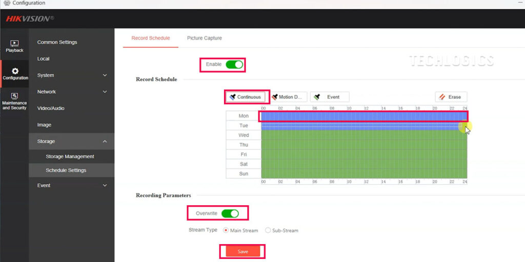 - For continuous recording, select “Continuous” and drag the schedule across all days.