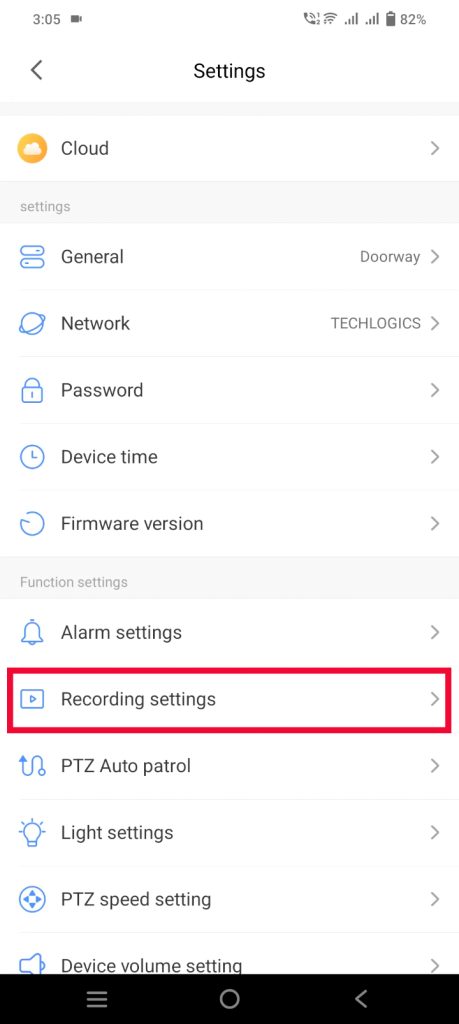 - The camera settings will appear. Select the “Recording Settings” option.