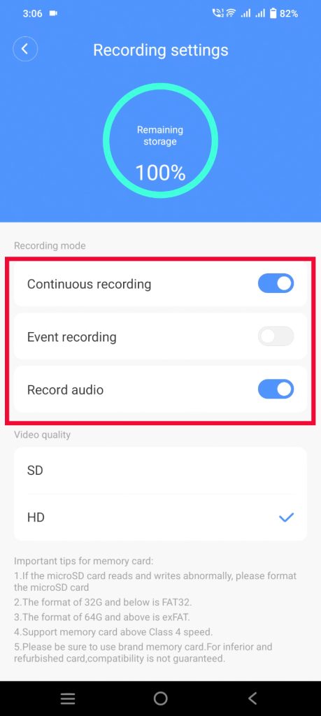 - Navigate to the ‘Recording Settings’ again to check the status of the memory card.