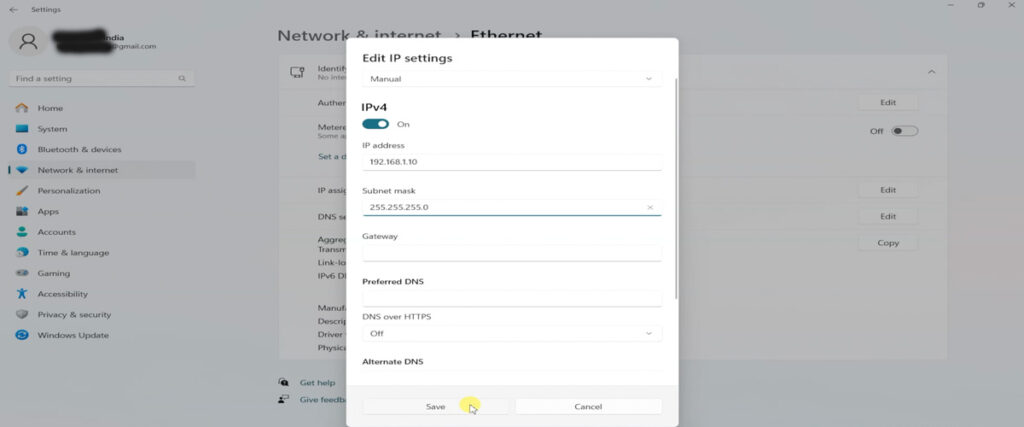 - Under IP assignment, click Edit, choose Manual, and enable IPv4.