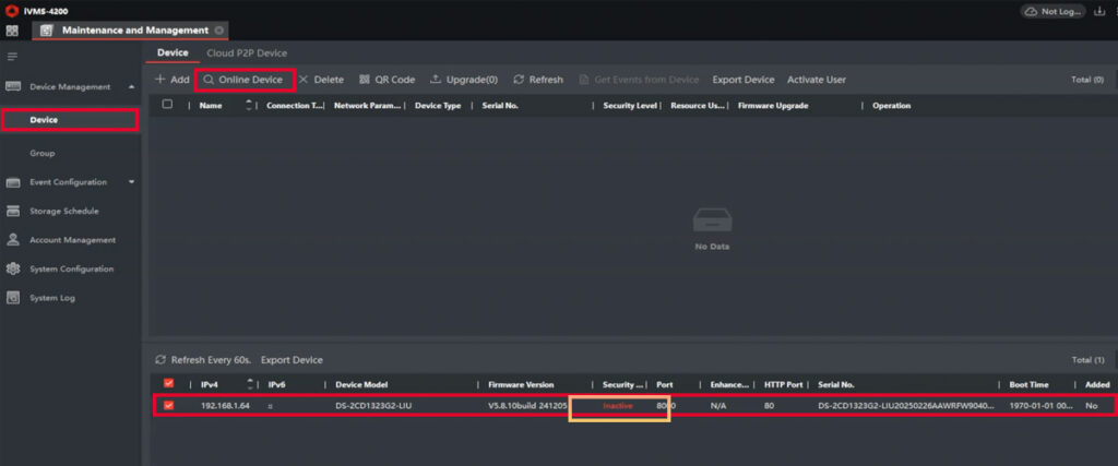- Open iVMS-4200 and navigate to Maintenance and Management > Device Management > Online Devices.