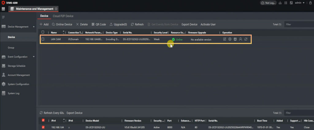 Once added, the camera will appear in the Device Management table with a green icon or Online status, indicating a successful connection.