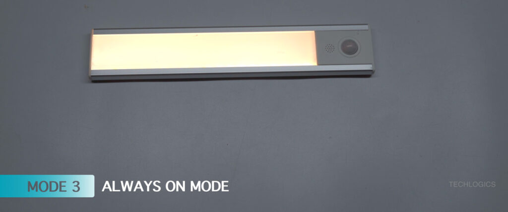 - Always-On Mode: Press the mode key a third time (light flashes three times). The light stays on continuously until the battery is drained, with no motion or light sensitivity features.
