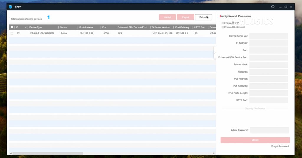 - Open the SADP tool on your computer and click the ‘Refresh’ button to retrieve a list of devices under the Hikvision manufacturer.
