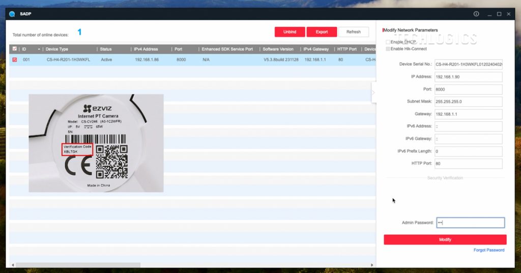 - Enter the ‘Admin password’ (verification code) from the EZVIZ camera label, then click ‘Modify’ to set the fixed IP address.