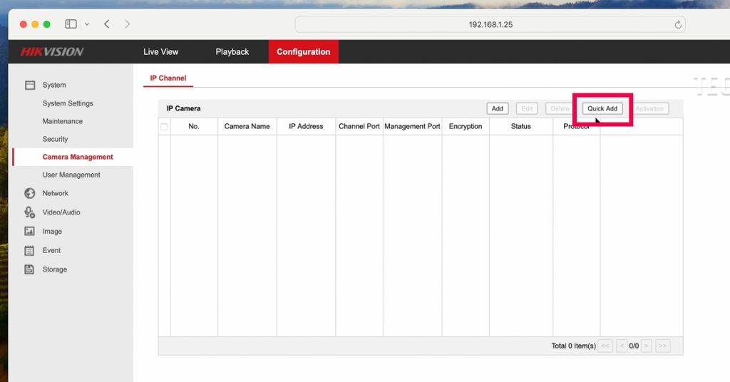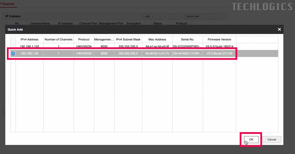 - Click the ‘Quick Add’ option to retrieve a list of cameras available on the same network.