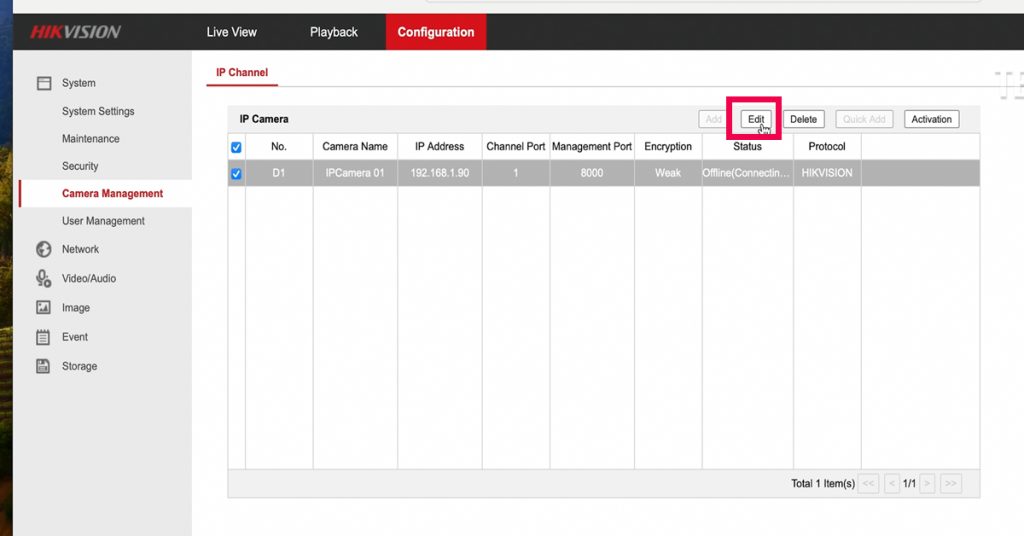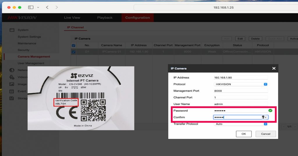 - If the camera status shows ‘Authorization Error’, select the camera and click the ‘Edit’ button to enter the camera password (verification code found on the EZVIZ camera label).