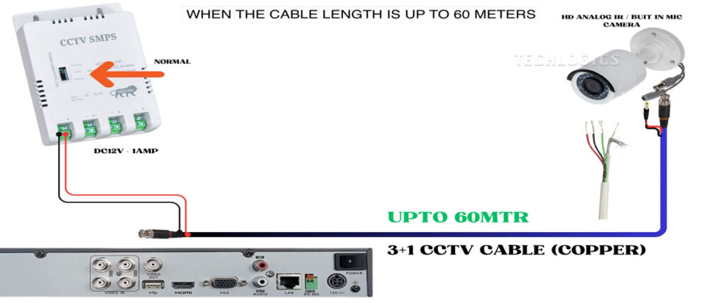 If, during the operation of the camera, you notice that it is not functioning correctly—particularly in night vision mode where the infrared (IR) LED is active—it may be necessary to consider switching to a different type of SMPS. A suitable option would be a single DC output SMPS rated at DC 12 volts with an output of 5 to 10 amps. This change ensures that the camera receives adequate power, especially when utilizing longer cable runs.