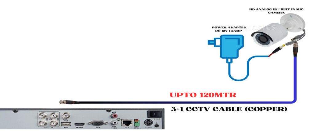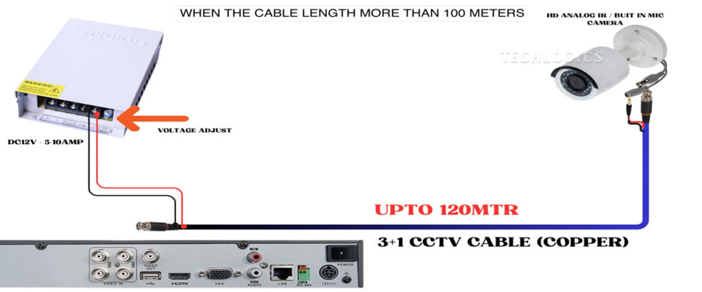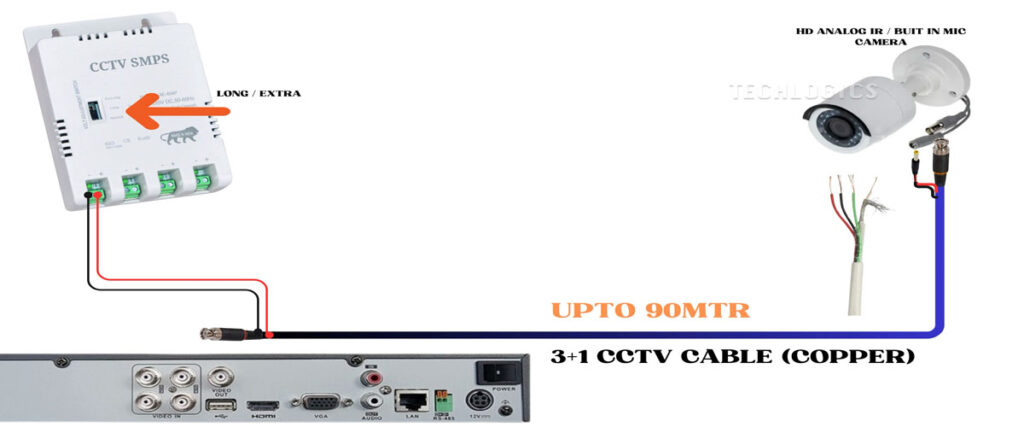 For runs extending up to 90 meters, a high-quality copper 3+1 CCTV cable is capable of transmitting both power and video signals effectively to the camera.