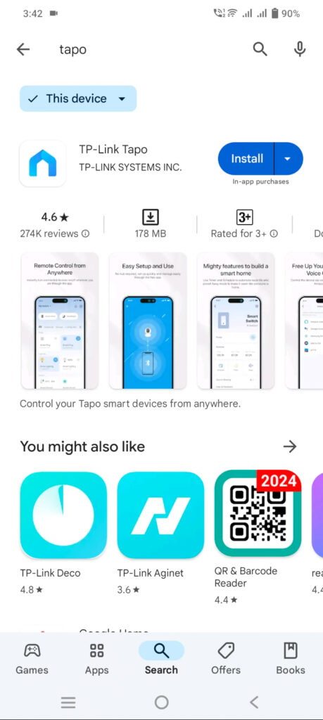 - For Android: Open the Google Play Store, search for “Tapo” (developed by TP-Link), and tap Install.