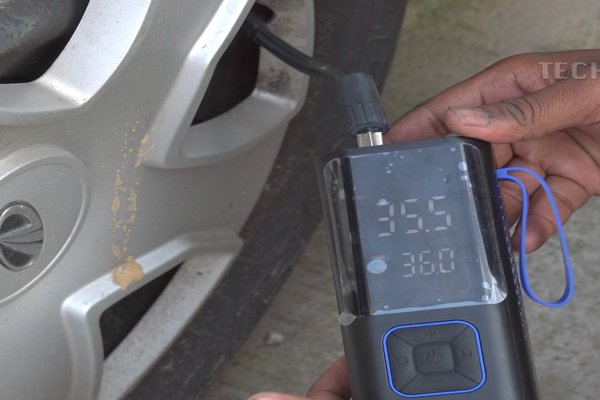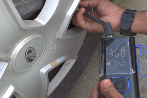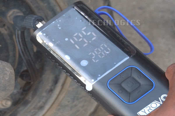 - Check the LCD Display: The large display will show the current air level of the tire while the hose is connected. For instance, if the display shows 19 PSI and you’ve set 28 PSI, the device will automatically stop inflating once 28 PSI is reached.